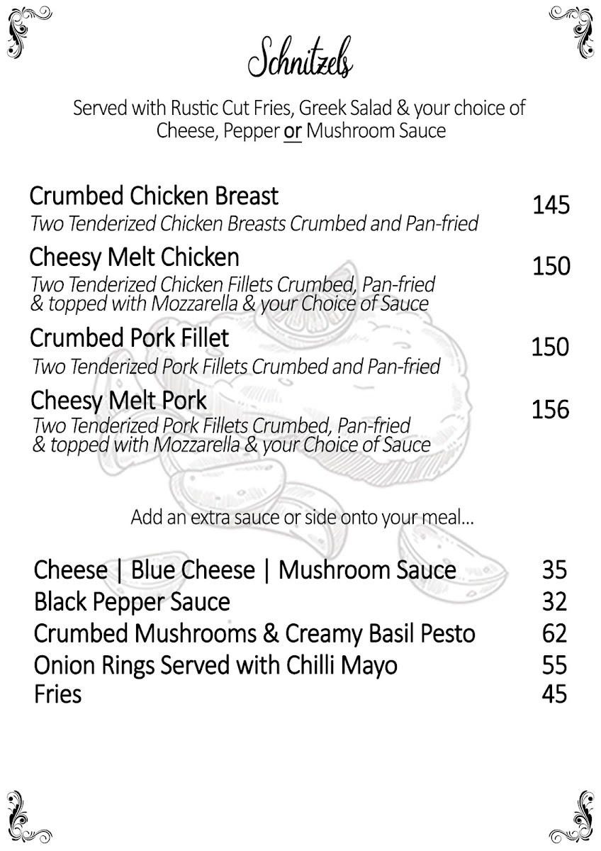 Two Tenderized Pork Fillets Crumbed, Pan-fried & topped with Mozzarella & your Choice of Sauce